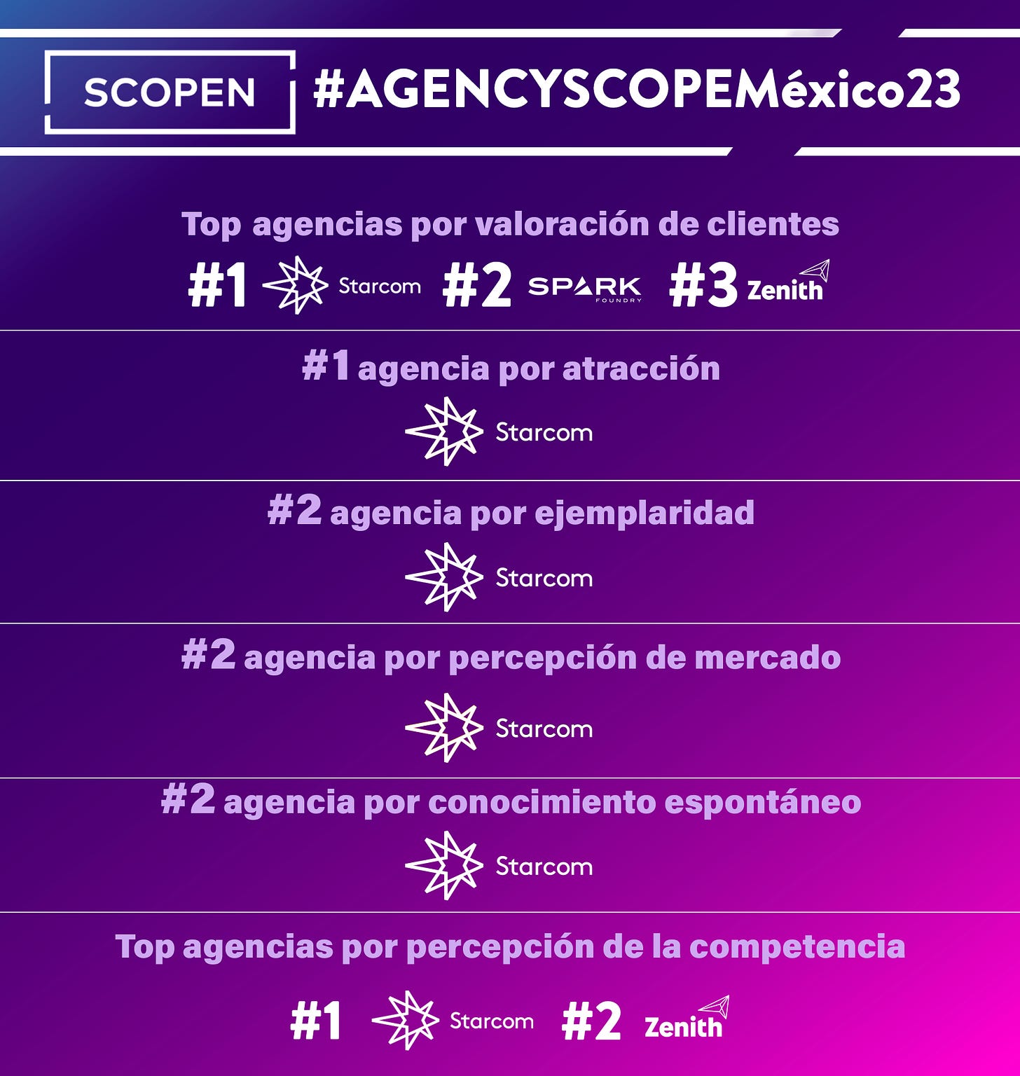 Gracias a ustedes, Starcom, Spark y Zenith, son las agencias de medios más valoradas por los clientes en el Agency Scope 2023